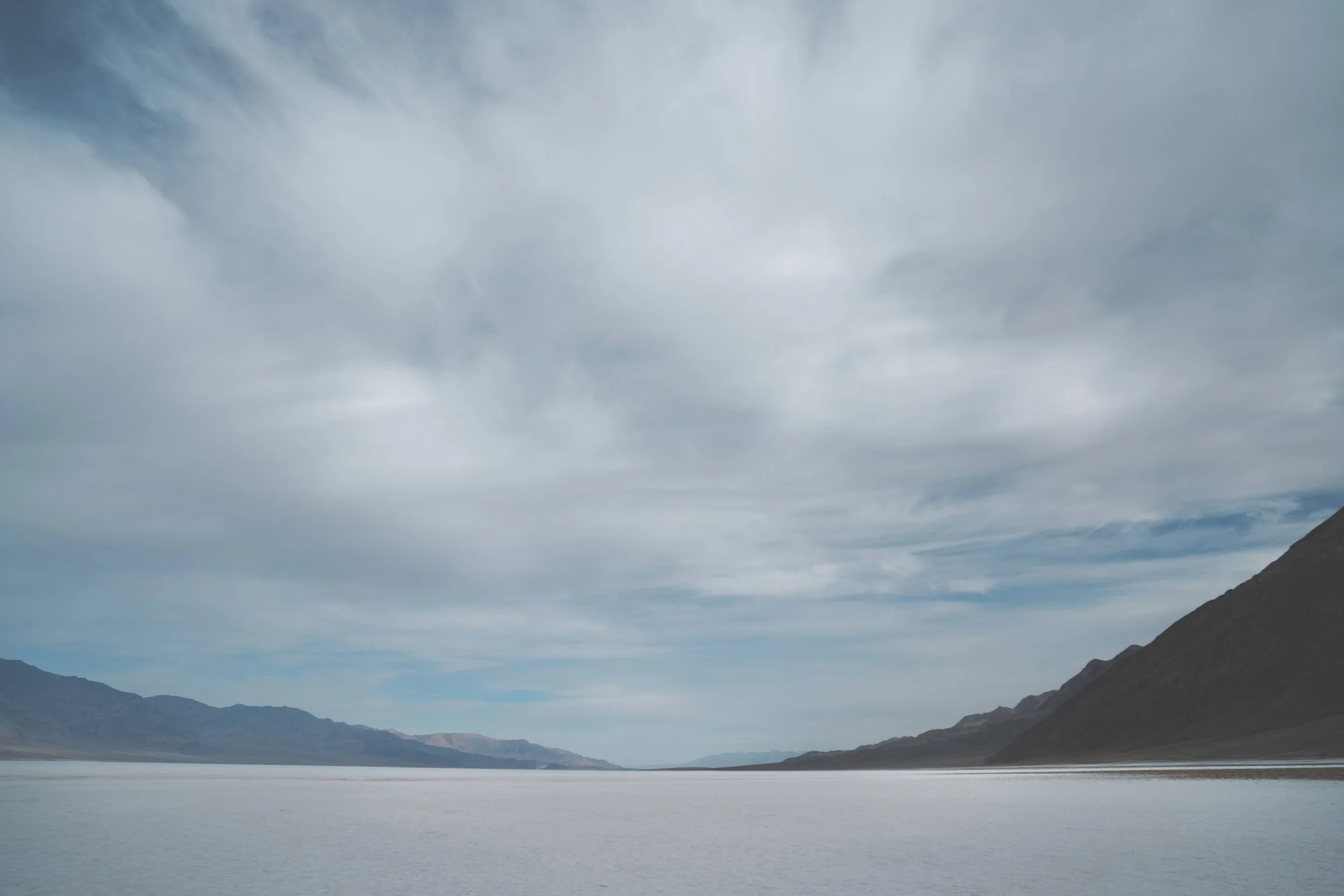 Beneath the vast and ever-shifting sky, the endless white salt flats of Badwater Basin lie perfectly still — the lowest point on the continent, yet reaching toward infinity.