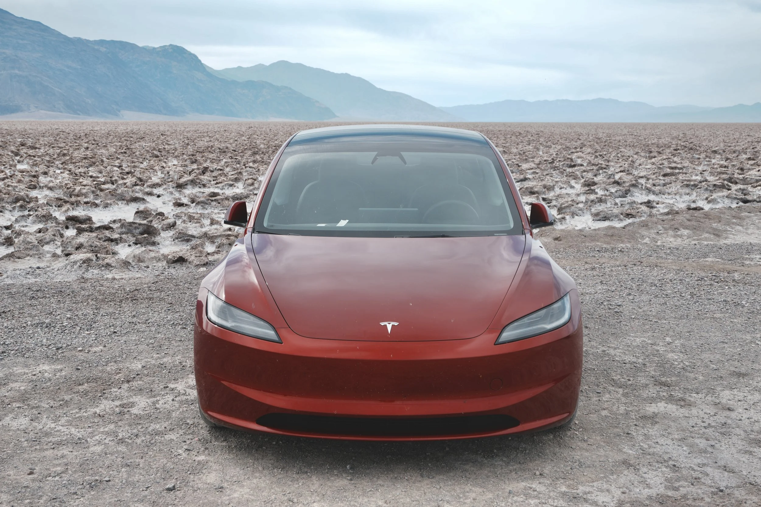Model 3, radiant and resolute on the otherworldly landscape of Death Valley.