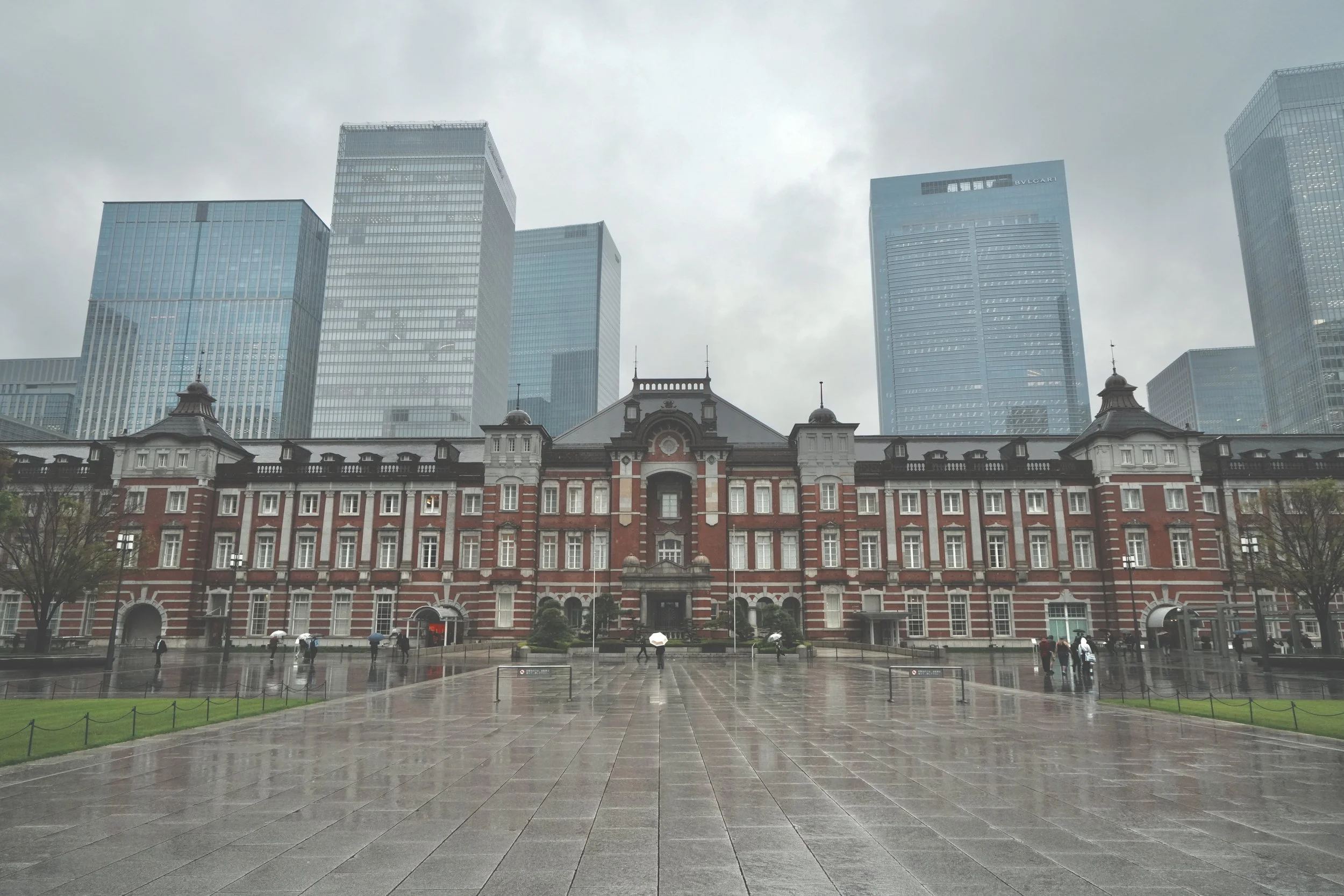 In the soft Tokyo rain, the historic station stands with quiet grace while the modern towers rise behind it — past and future in seamless reflection on wet stone and glass. The Afterstring bends, holds, and continues.