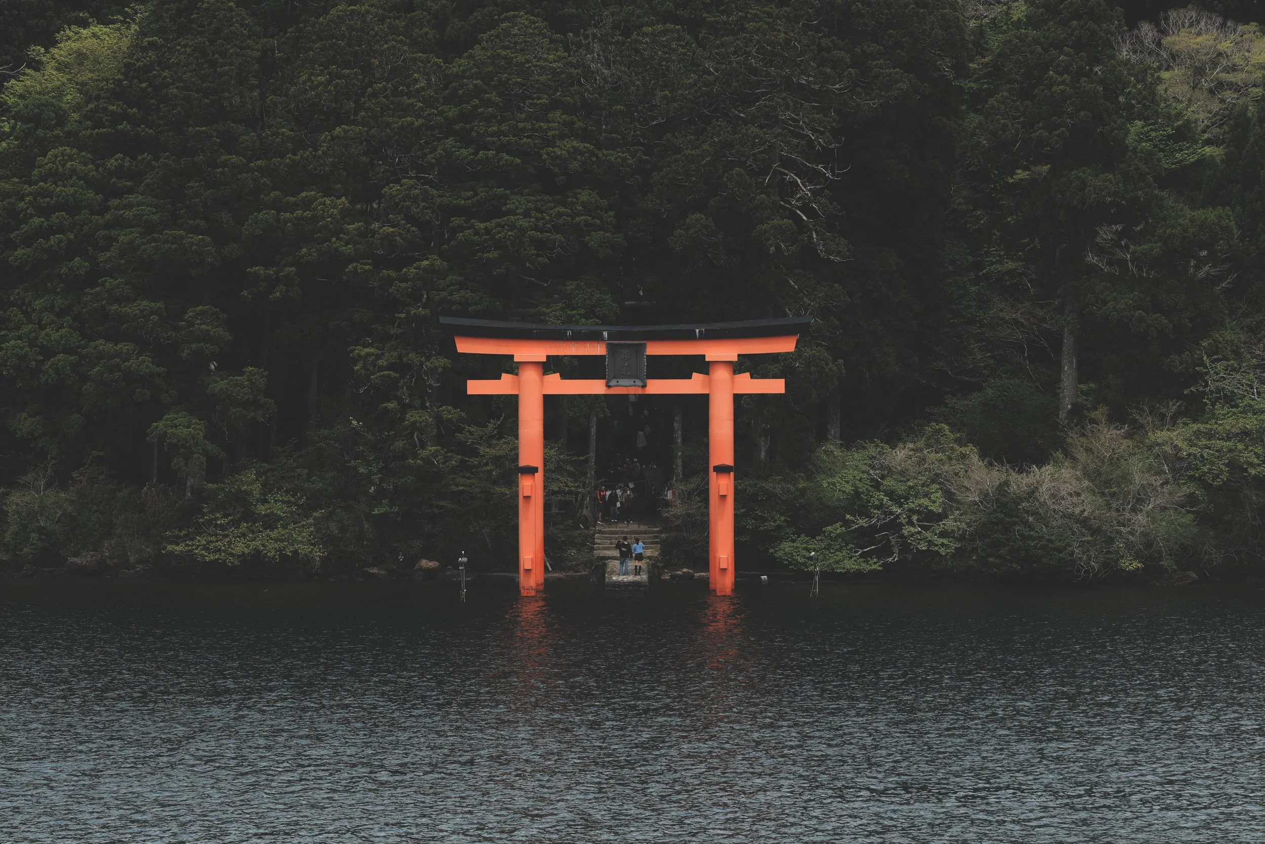 The vermilion Torii of Hakone Shrine stands steadfast in the waters of Lake Ashi — a living threshold between the lake and the forest.